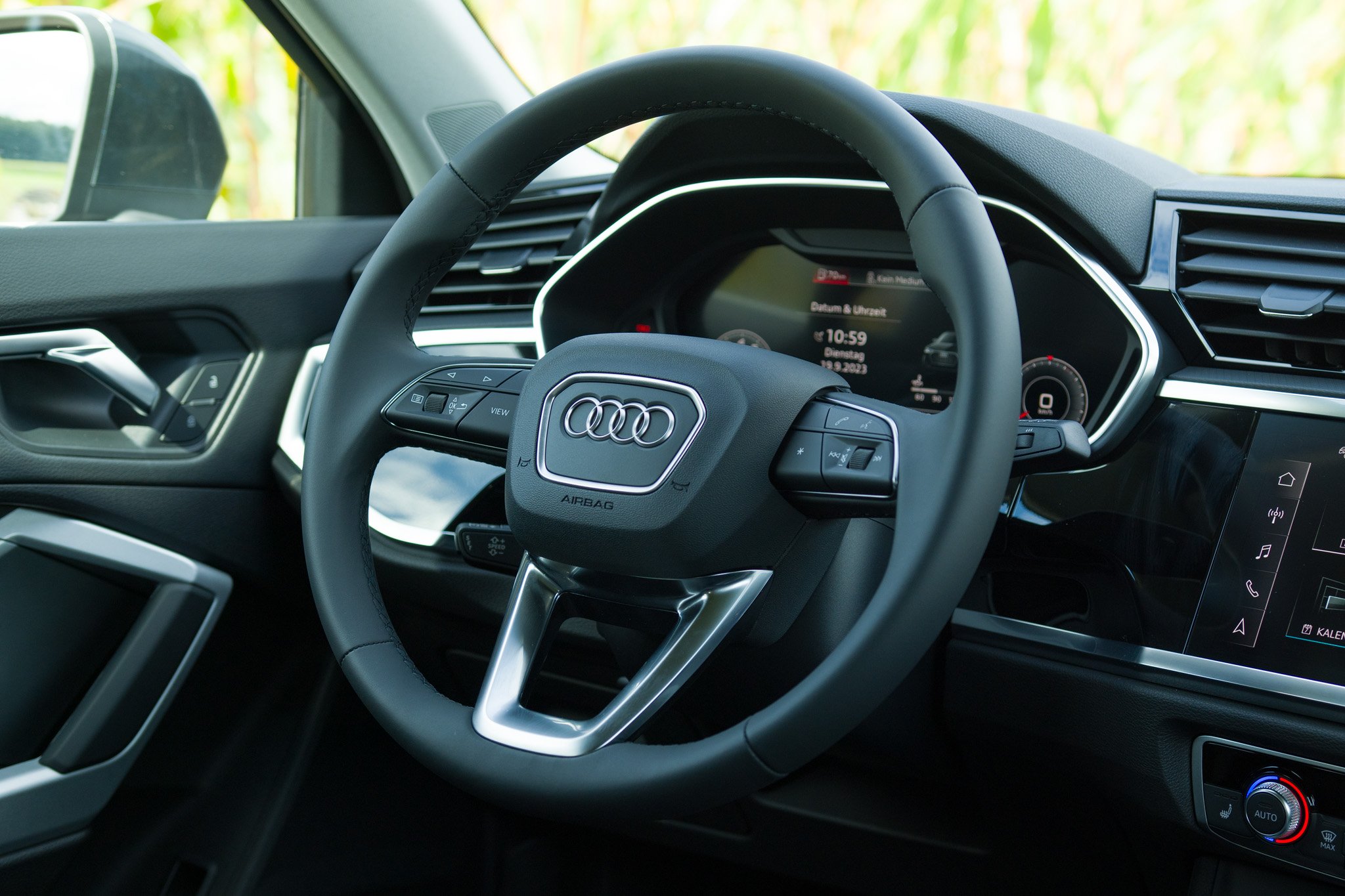 Das Multifunktionslenkrad mit feinem Leder ummantelt bietet diverse Bedienmöglichkeiten. Groß dimensionierte Drehregler und Schalterelemente ermöglichen den direkten Zugriff. Versehen mit einem Dekorelement in Silber matt fügt sich das Lederlenkrad optisch sowie haptisch in das Cockpit des Audi Q3 Sportback ein. Auf Wunsch besteht bei Bestellfahrzeugen den Wohlfühlfaktor mit einem beheizbaren Lenkrad auszustatten.