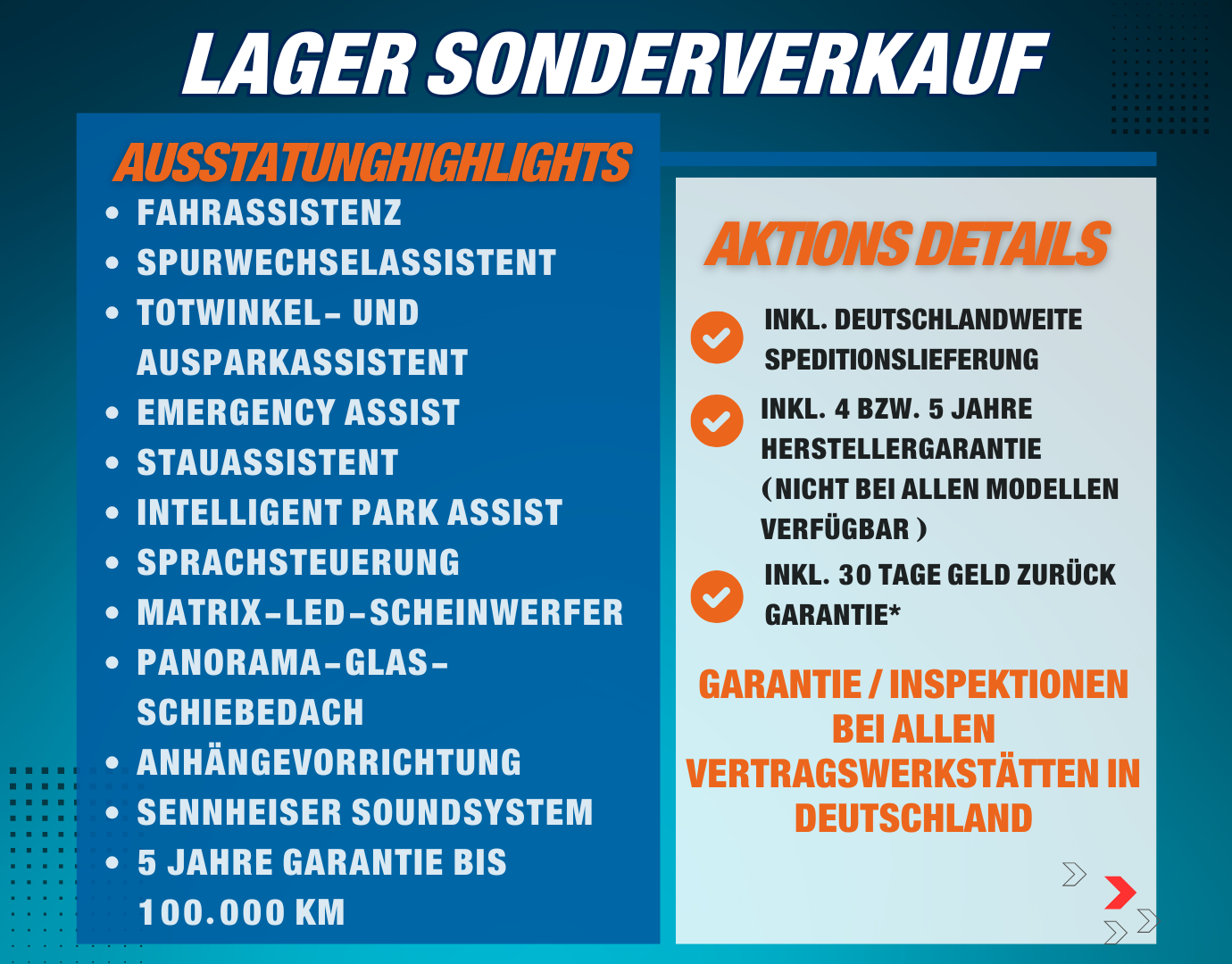 Hinweis zur Serienausstattung: Die Serienausstattung entspricht in weiten Teilen dem deutschen Modell – oft sogar mit weiteren Extras inklusive. Aus Platzgründen ist nur ein Auszug dargestellt. Für Details kontaktieren Sie bitte unser Verkaufsteam.