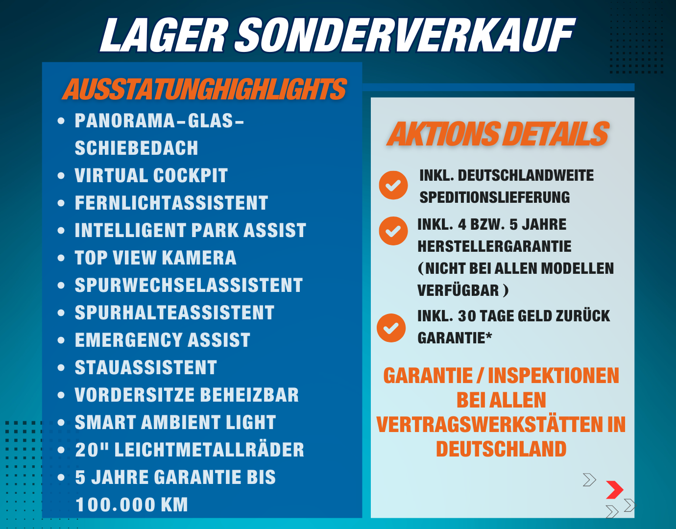 Hinweis zur Serienausstattung: Die Serienausstattung entspricht in weiten Teilen dem deutschen Modell – oft sogar mit weiteren Extras inklusive. Aus Platzgründen ist nur ein Auszug dargestellt. Für Details kontaktieren Sie bitte unser Verkaufsteam.