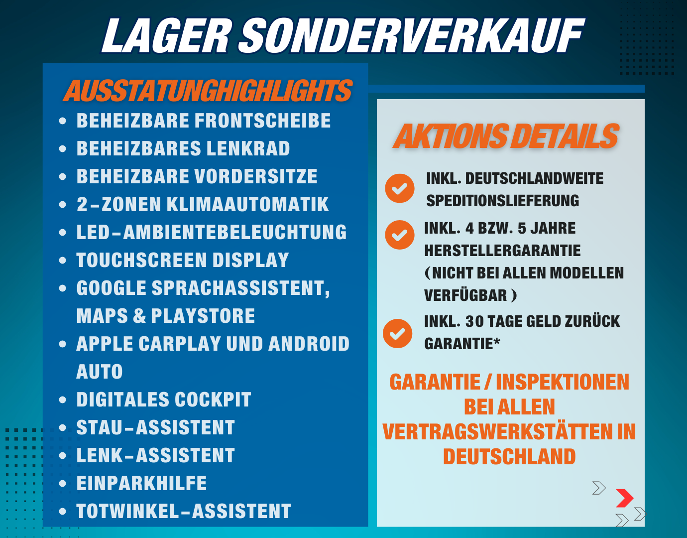 Hinweis zur Serienausstattung: Die Serienausstattung entspricht in weiten Teilen dem deutschen Modell – oft sogar mit weiteren Extras inklusive. Aus Platzgründen ist nur ein Auszug dargestellt. Für Details kontaktieren Sie bitte unser Verkaufsteam.