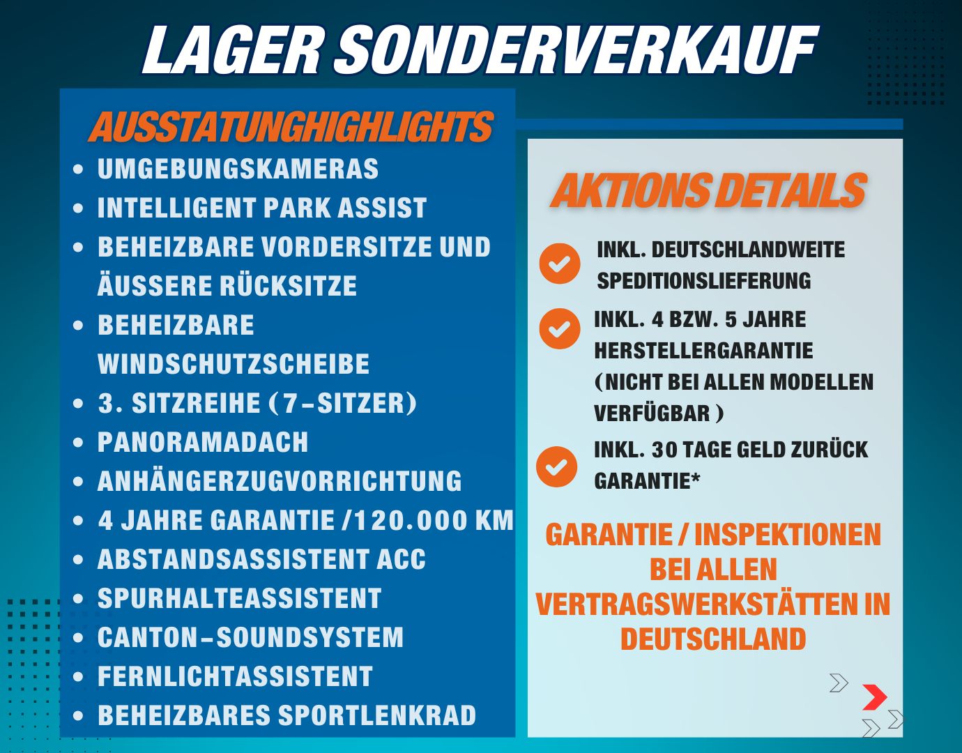 Hinweis zur Serienausstattung: Die Serienausstattung entspricht in weiten Teilen dem deutschen Modell – oft sogar mit weiteren Extras inklusive. Aus Platzgründen ist nur ein Auszug dargestellt. Für Details kontaktieren Sie bitte unser Verkaufsteam.