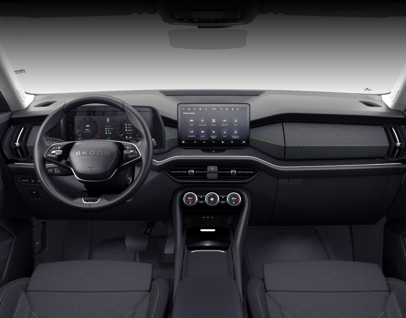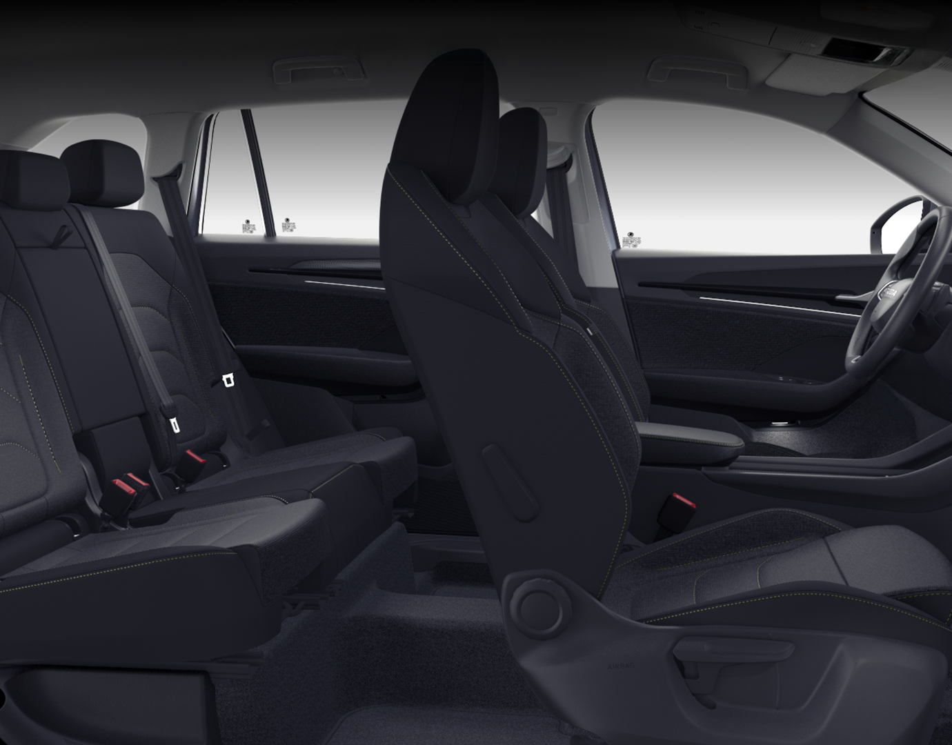 Innenausstattung Innenausstattung "Loft" bestehend aus: Komfortsitze in Stoff (schwarz/Ziernähte grün); Dekor Metallic grey; Armaturentafel-Mittelteil in Stoff (grau); Türverkleidung in Stoff/Kunstleder-Kombination (grau/schwarz); Dachhimmel grau; Mittelarmlehne in Kunstleder (schwarz/Ziernähte grün); LED-Ambientebeleuchtung (Streifen an den Türen vorne/hinten, Armaturentafel, Fußraum vorne/hinten, Staufächer in den Türen vorne/hinten)