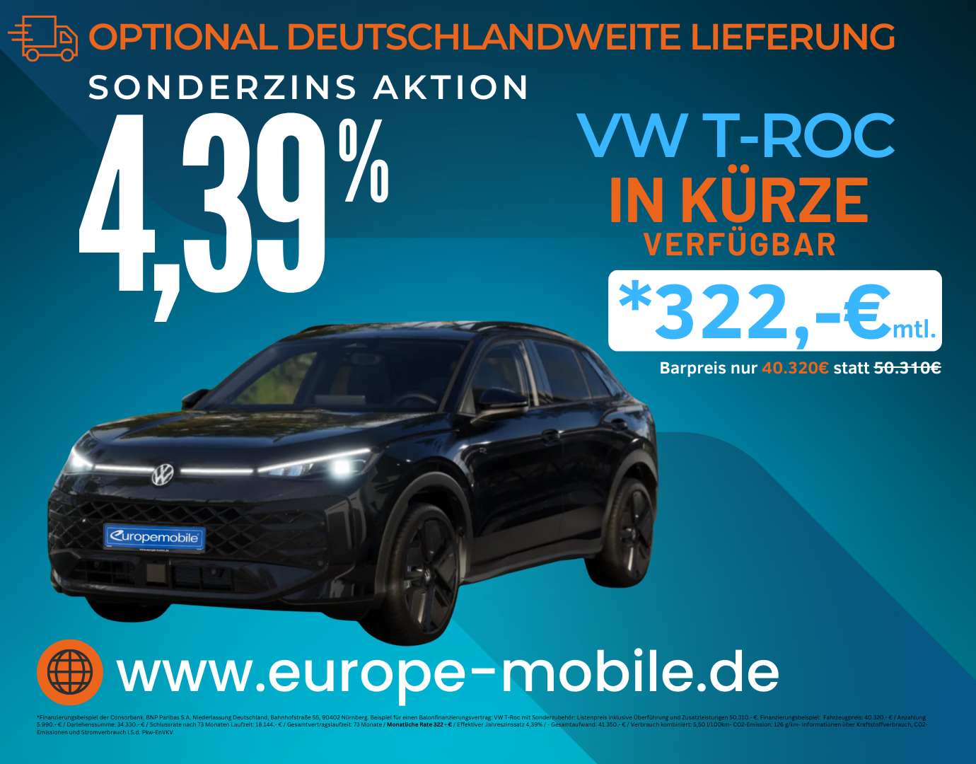 *Representatives Finanzierungsbeispiel der Consorbank, BNP Paribas S.A. Niederlassung Deutschland, Bahnhofstraße 55, 90402 Nürnberg. Beispiel für einen Ballonfinanzierungsvertrag: Fahrzeugpreis: 20.000.- € / Anzahlung 3.000.- € / Darlehenssumme: 17.000- € / Schlussrate nach 73 Monaten Laufzeit: 5.900 € / Gesamtvertragslaufzeit: 73 Monate / Monatliche Rate 234.- € / Effektiver Jahreszinssatz 4,39% / - Gesamtaufwand: 22.515,42.- €